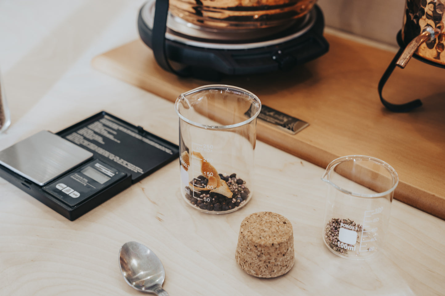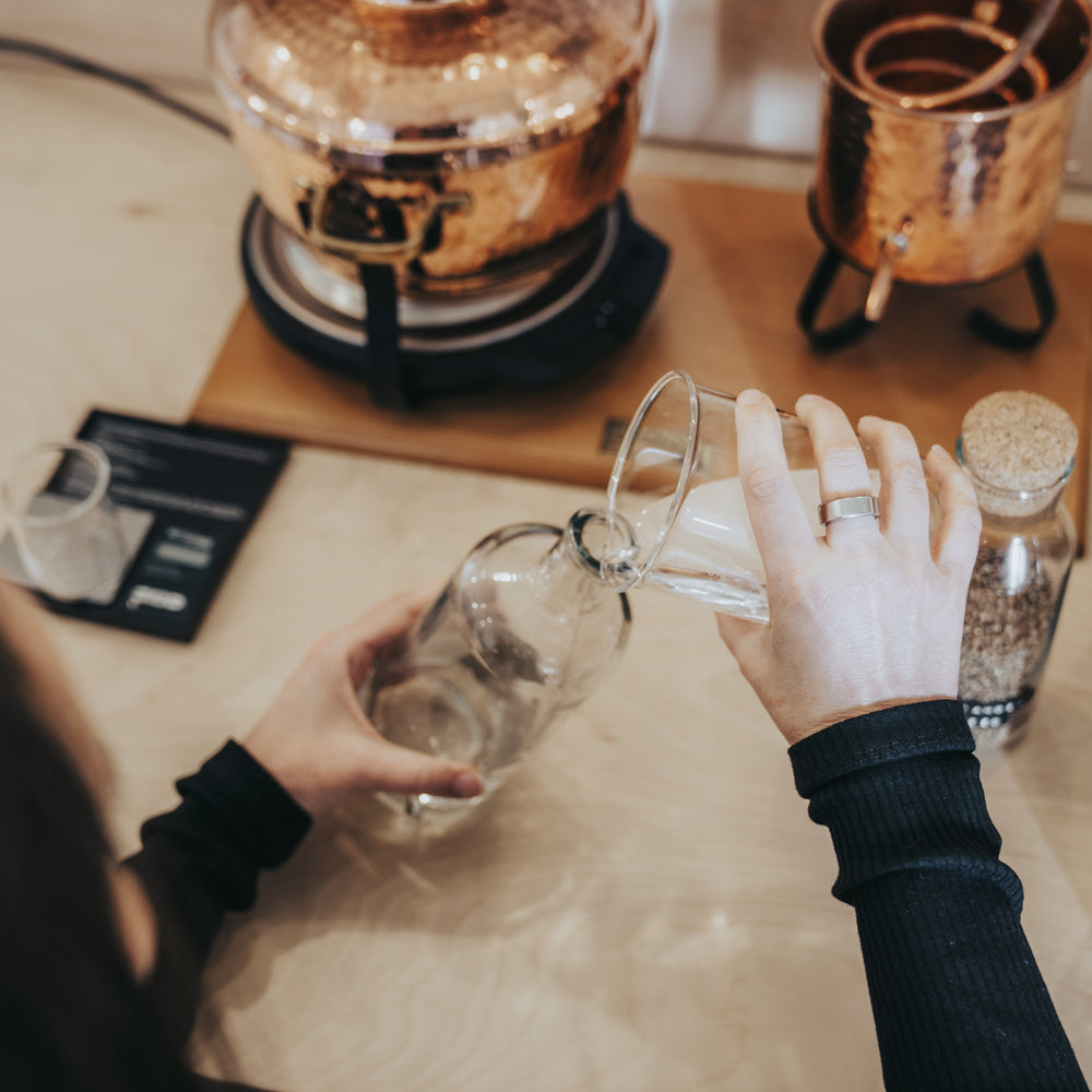 Next, you'll weigh out and distill your recipe on one of our mini stills, to create a full size 70cl bottle of your gin to take home, and then hand label and finish your bottle.